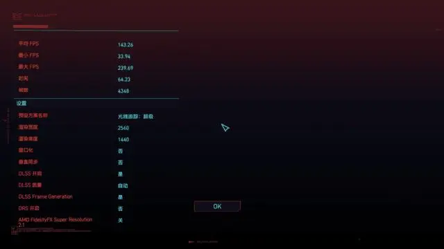 The first game is “Cyberpunk 2077”. I directly maxed out the test image quality, selected 2K resolution, adjusted the image quality to Ray Tracing: Super, and turned on DLSS Frame Generation. Running the built-in Benchmark, we finally got an average score of 143.6 frames. Being able to run “Cyberpunk 2077” at a frame rate of more than 140 frames under 2K full light tracking, this kind of game performance is really exaggerated.